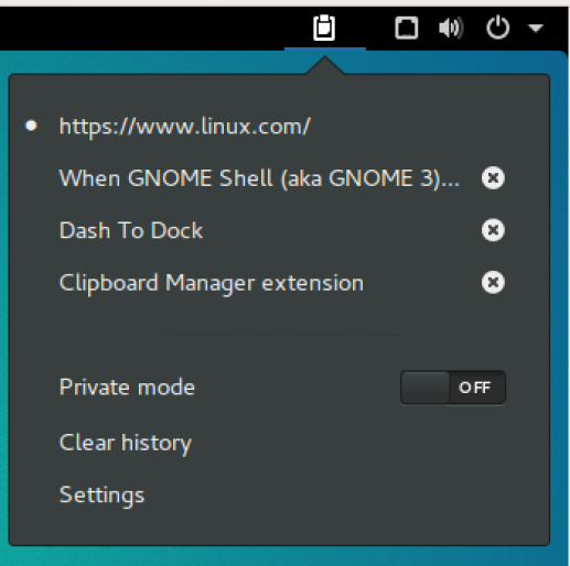 在安装之后,Clipboard Indicator 会出现在顶部面板当中,用以提供曾经复制至剪贴板的全部历史记录。只需要点击该标识而后选择要使用的文本内容(如图二),再配合 Ctrl+V 即可完成历史文本复制。