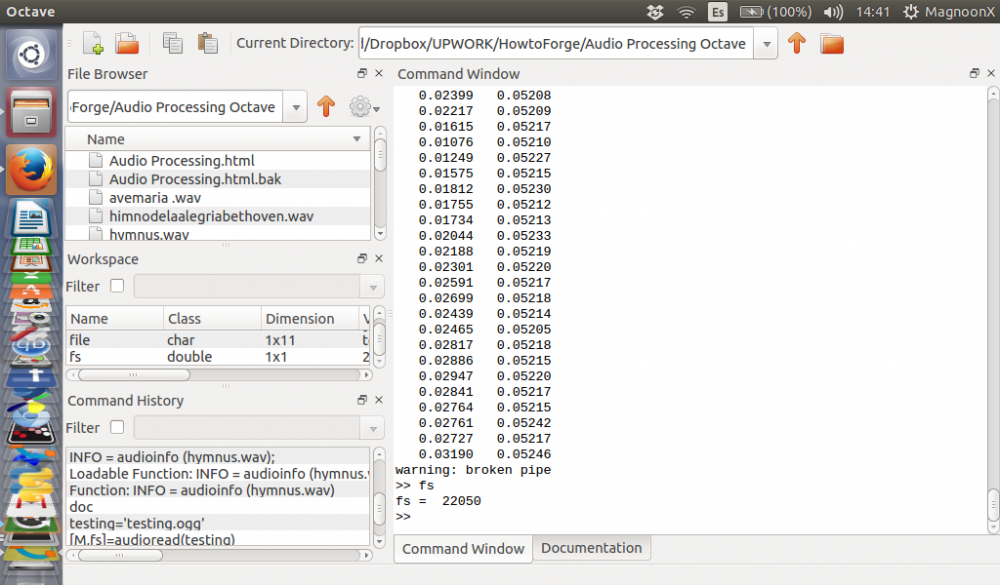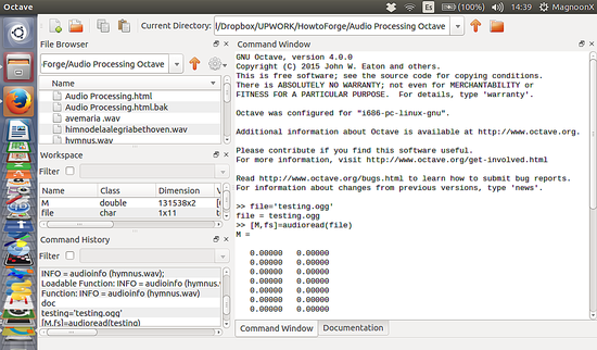 在本教程中我会使用 ogg 文件来读取这种文件的属性,比如采样、音频类型(stereo 和 mono)、信道数量等。必须声明的一点是教程中使用的所有的命令都是在 Octave 终端窗口中执行的。首先,我们必须要把这个 ogg 文件赋给一个变量。注意:文件必须在 Octave 的工作路径中。
