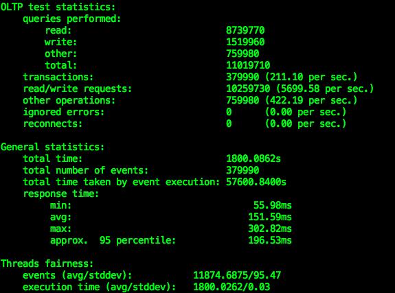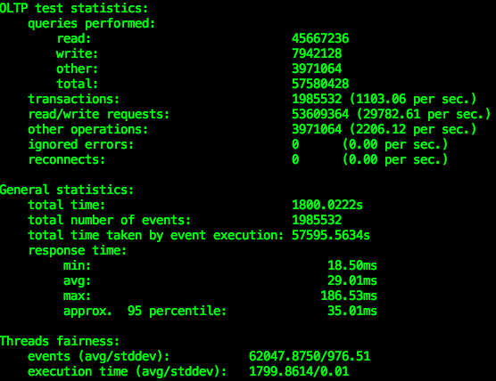 同时,对于写操作,稍微提高了 update 操作的比例。最终运行的测试中,每一个事务的读操作和写操作的比例是 6:1 左右。为了模拟项目启动之后的场景,我的 sysbench 测试集的数据量是总共 20 张表,每张表 200 万行数据,开启 32 个线程,并行向数据库发送事务请求,共运行 30 分钟。下面是我观察到的结果: