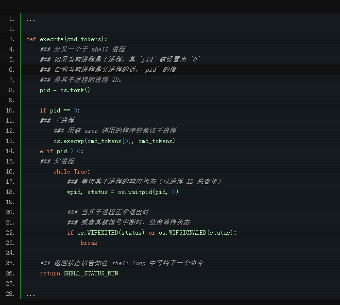 当 os.execvp 在子进程中被调用时,你可以想象子进程的所有源代码被替换为正被调用程序的代码。然而父进程的代码不会被改变。当父进程完成等待子进程退出或终止时,它会返回一个状态,指示继续 shell 循环。