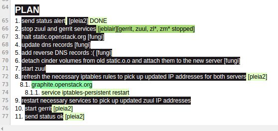 我们使用的是由freenode公司提供的Internet Relay Chat(简称IRC),能够与之对接的开源客户端可谓多种多样。在它的帮助下,我们能够随时探讨问题与挑战、构建解决方案、通知进度变化、发布项目状态变更与警告,并设置了机器人负责待审查的基础设施变更提交内容。我们使用的IRC频道完全公开,同时设置了专门的频道记录服务器供各位使用者随时查看。
