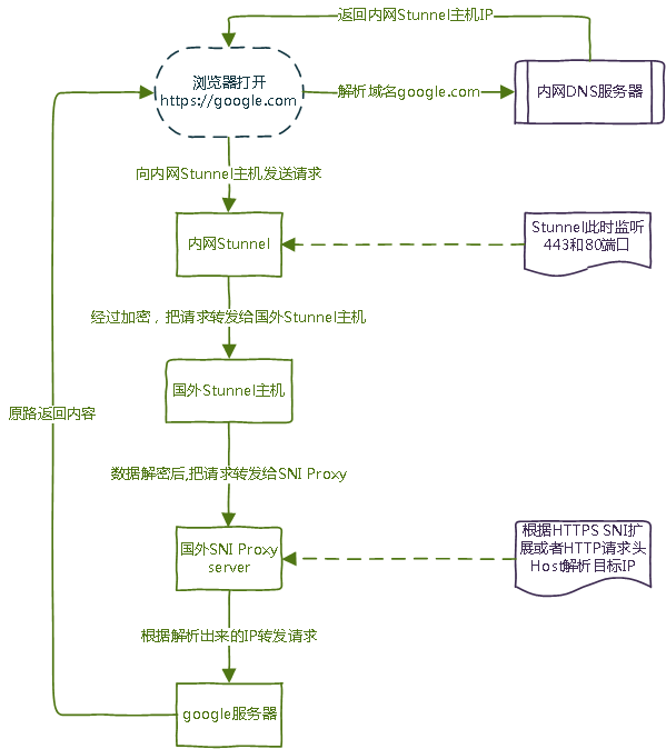 7、sniproxy再根据HTTP Host请求头或者HTTPS sni扩展的域名解析出谷歌服务器的IP,并把请求转发给谷歌服务器。