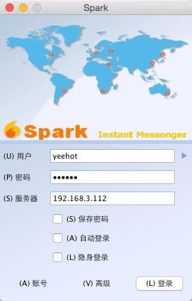 这里我们直接用官网上的Spark来测试我们的实时信息,在官网下载好spark,点击安装,安装好后,我们需要注册一个帐号,注册帐号的步骤,如下图,这里需要注意的是服务器地址,这里的地址就是我们刚才输入的域名地址,我们可以输入服务器的IP地址,如果是本地测试的可以输入127.0.0.1或者所有域,或者域名,这个根据具体情况输入。