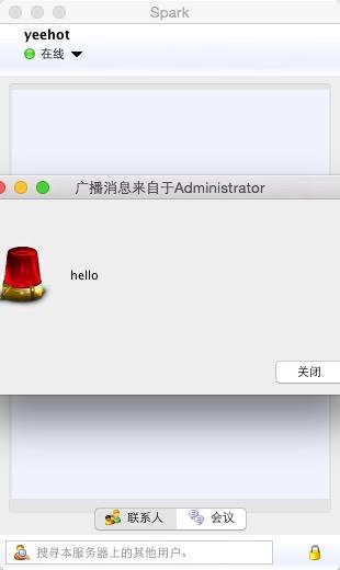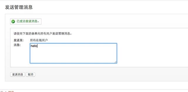这时我们登录后管理平台上,想利用后台群发一条信息到客户端,我们点击会话->工具->发送信息,然后输入我们的内容,例如hello.点击发送后客户端会收到hello,这时说明实时内容已经到达了。