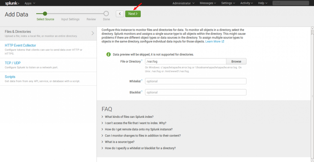 我要加入一个例子为一个简单的任务,它被添加到 Splunk 系统。只是看到我的快照,以了解我将如何添加它。我的任务是将 /var/log文件夹添加到Splunk系统的监测。
