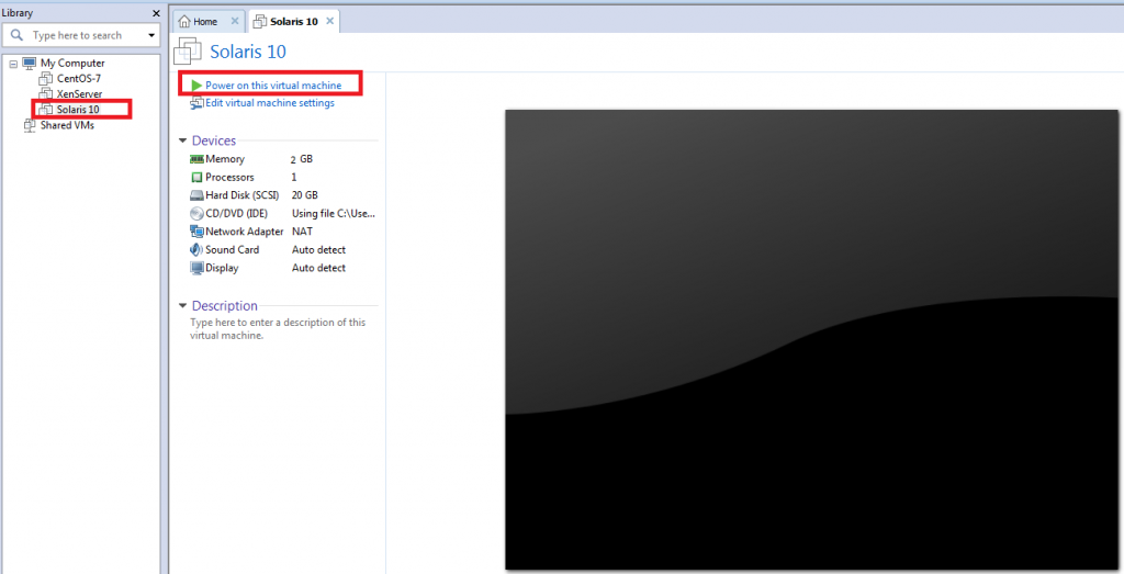 打开VMware工作站在你的主页,选择您创建的虚拟机Solaris 10,并点击按钮如下所示。