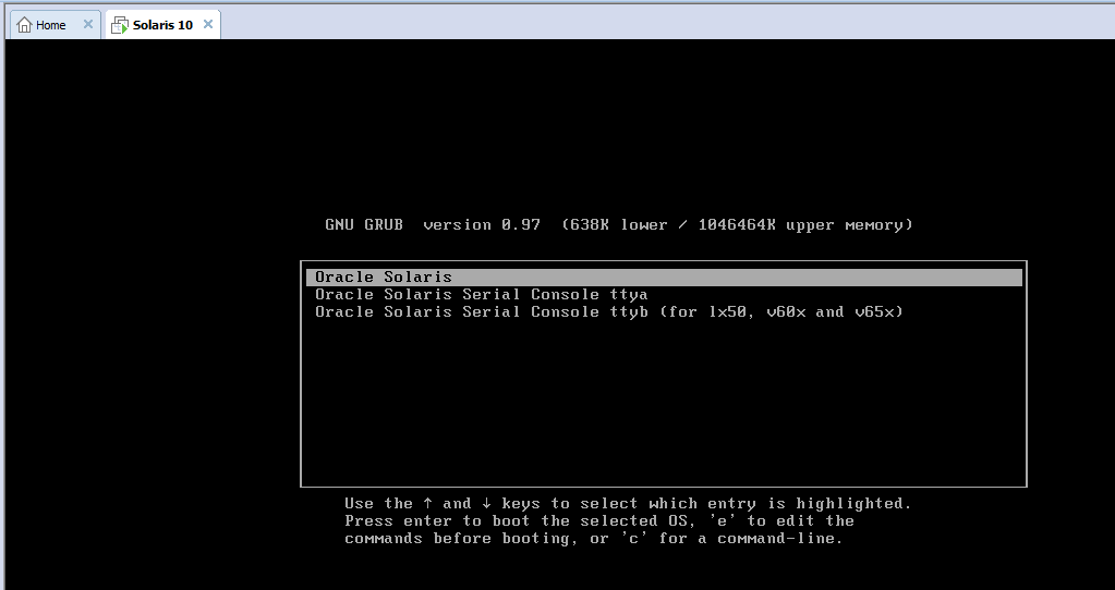 一旦你启动虚拟机,您将看到grub菜单,VM将开始从Solaris引导,图像如下所示。
