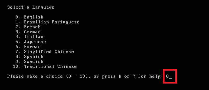 从0-10选项当中通过选择键选择你的语言,并按回车键继续。