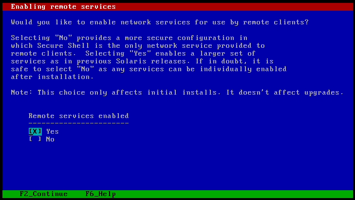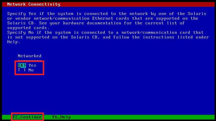 选择“Yes”选项来指定您的Solaris系统连接到网络,按“F2”继续。
