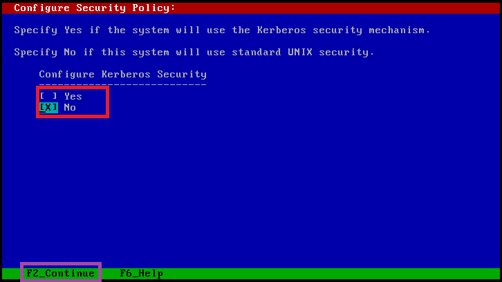 在本节中,我们配置标准的UNIX安全策略,如果您希望使用Kerberose安全选项,你可以选择“Yes”选项,然后按F2键继续。