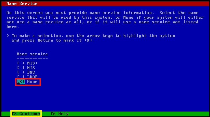 选择的选项设置为你的网络名称服务,如果您不使用任何名称服务然后选择“None”选项,然后按F2键继续。