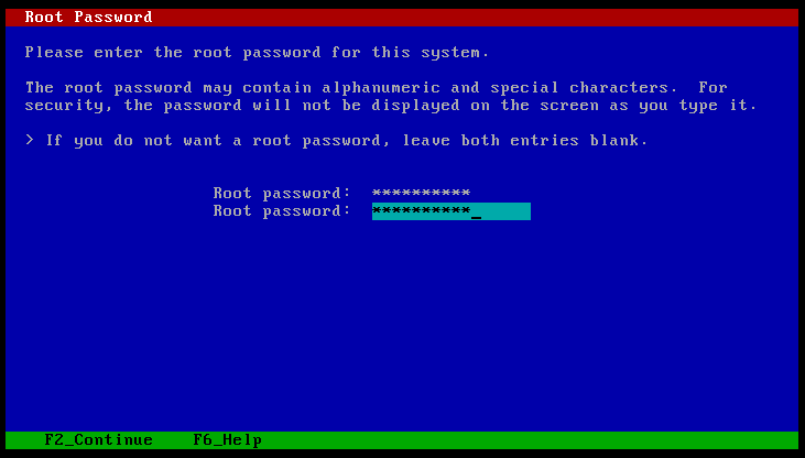 为您的系统设置根密码,如果你不想设置密码可以为空,按F2键继续。