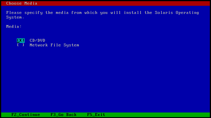 选择介质:在这里你需要指定的介质安装Solaris操作系统,所以,我们要选择CD/DVD ROM。