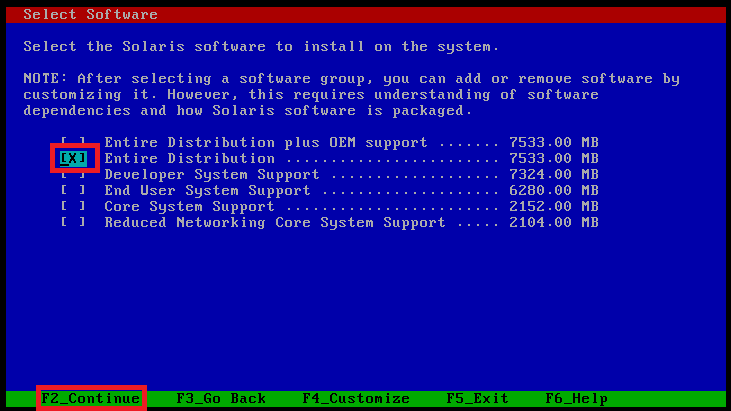 选择第二个选项全部分布的软件在您的系统上,安装Solaris并按“F2”键进入下一个选项。