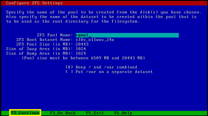 现在配置您的ZFS根文件系统,按F2键继续安装。
