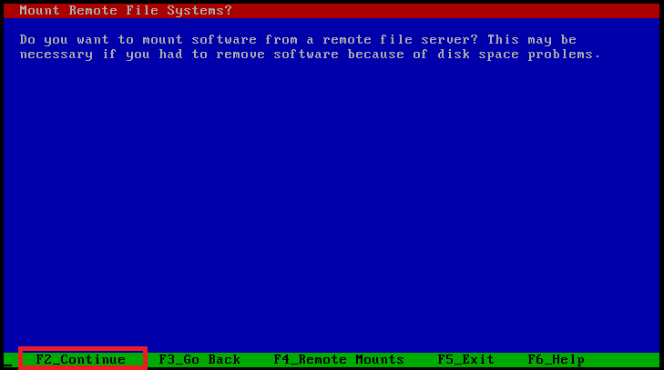 按F2键安装远程文件系统,这将有助于在任何空间问题上。