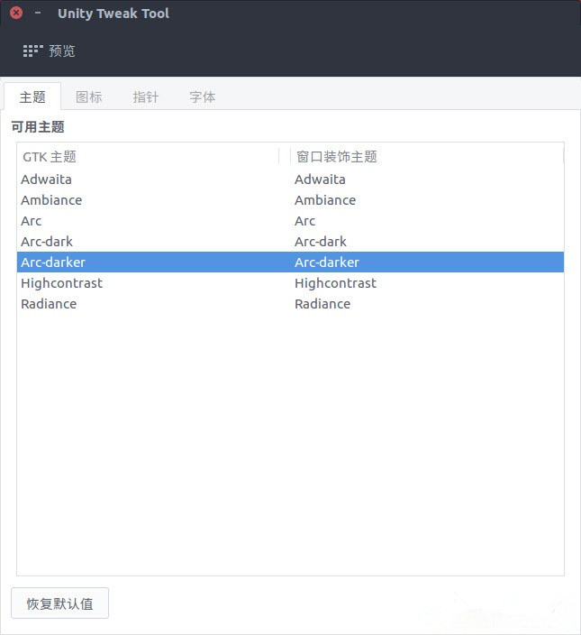 5.打开 Unity Tweak Tool 工具,在「主题」选项的 GTK 主题列表中选择你所喜欢的 Arc GTK 主题系列(Arc、Arc-dark 或 Arc-darker 主题)即可。