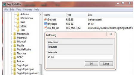 2、在注册表里面找到:HKEY_CURRENT_USER\Software\kingsoft\Office,在language那里将“en_US”改成“zh_CN”,之后重新打开WPS就会是中文了。