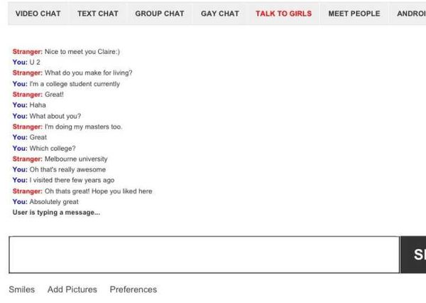 在 Omegle 首页,点击"start a chat"后,Omegle 就会随机抽选一个在线的用户成为你的聊天搭档,并为你构建一个一对一的二人聊天室,在这里,当然你不会知道对方的名字、国籍、性别、年龄,所有的信息被红色的"Stranger"一词代替,对方也许是个小孩子,也许是个老头,也许是个美女,也许是个逃犯,也许是个明星,也许是个政要......除了在接下来的坦诚的聊天中外你无从得知。陌生的人,形形色色的身份,在这样一个陌生的虚拟世界,会聊些什么呢?想知道答案的话,不妨进去体验一番,也许,你会惊奇地发现,跟你转弯抹角聊了半天的人,原来就和你住在同一个城市甚至同一个街区还甚至是同一栋楼房。