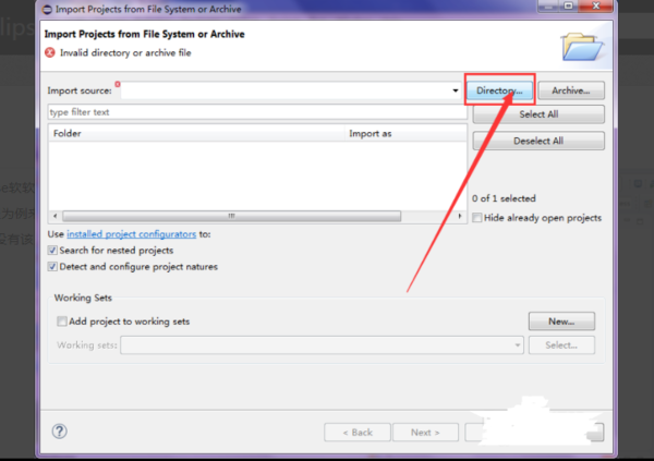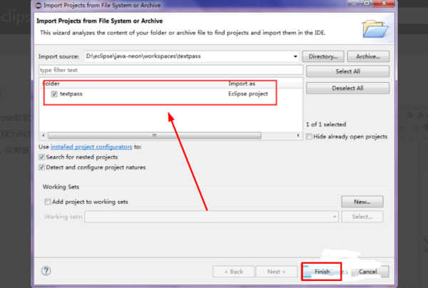 5、正确找到目录后,会在列表中出现一个工程的名称,并且刚才左上侧的“红错号”消失了;然后,单击“完成”(finish)就可以了;