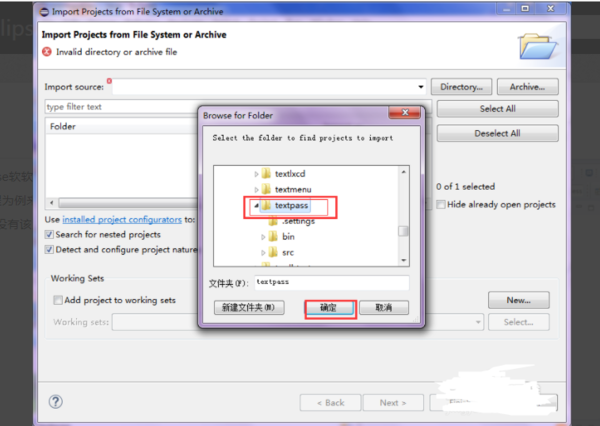 4、单击后,就会跳出一个查找工程的窗口,在其中找到要打开工程所在的文件夹,该文件夹下应含有“java project”文件类型的文件;单击“确定”;