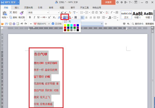 3、选择颜色:选中要标记的文字,所选文字区域填充颜色已经改变,如图所示;