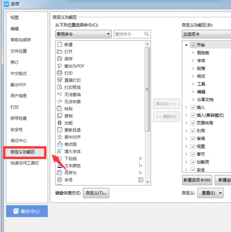 2、点击【自定义功能区】。