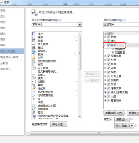 3、勾选右侧的【设计】选项卡组。点击确定。