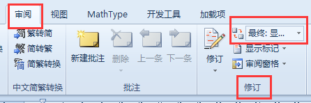 2、显示最终状态:在“审阅”功能区,“修订”分组,按“显示以供审阅”按钮,选择“最终状态”;
