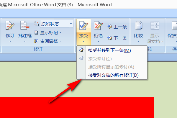 4.此时就会出现一个下拉菜单栏,勾选接受对文档的所有修订,然后将文档保存,以后再打开就是最终状态了。