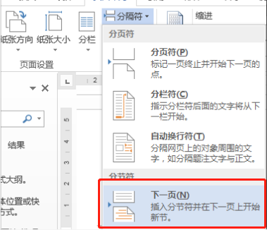 (2)用鼠标依次点击“页面布局-分隔符-分节符-下一页”