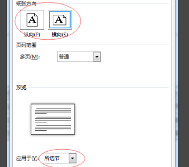 5、分节后调整页面。将光标放在表格所在页面,点击页面布局-页面设置右下角箭头会弹出下图对话框。选择纸张方向为“横向”,选择应用于“所选节”。点击“确定”。