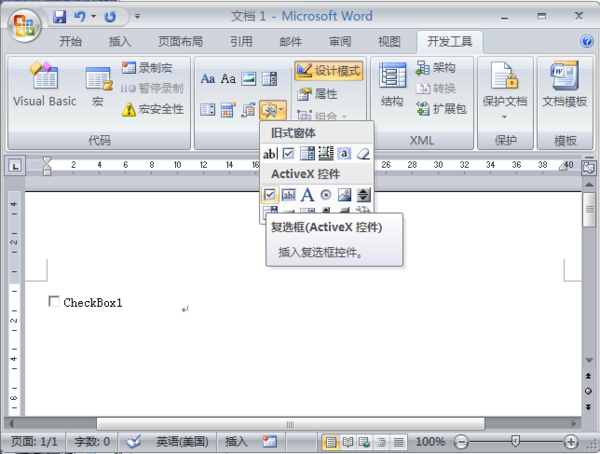 打开Word2007在菜单栏中点击“开发工具”单击“文件夹”图样的按钮,选择“复选框(ActiveX控件)”。