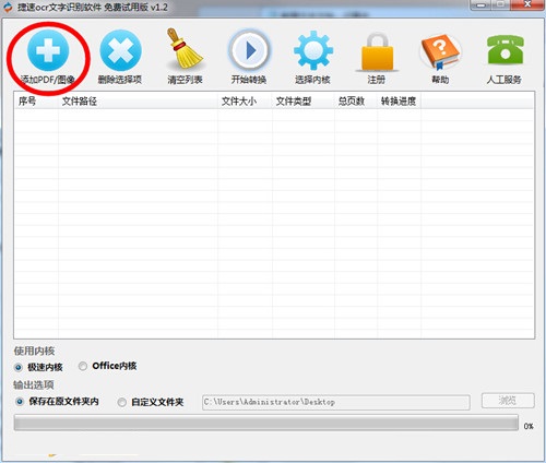 打开下载好的软件,直接进入操作主界面,点击上方左起第一个“添加文件”按钮,将需要识别的文件按提示添加到软件中。