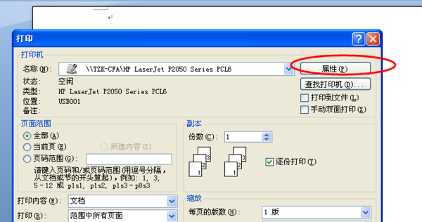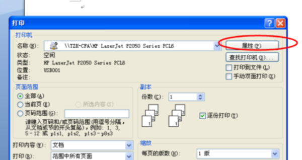 1、按Ctrl+P,打开打印机,点击属性。