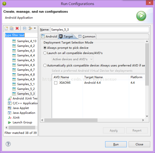 在eclipse中选择Run——Run Configurations,在左边选择好你要调试的工程,然后将右边切换至Target标签下