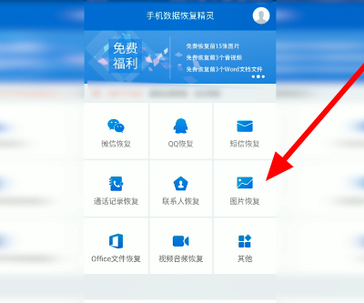 1、首先我们打开手机数据恢复精灵,点击打开“照片恢复”。