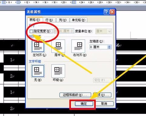 4、打开表格属性对话框,选择表格选项卡,将“尺寸”一项的“指定宽度”前面的对号勾掉。