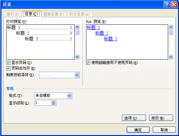 3.在对话框中单击“目录”选项卡,进行相关设置后,单击“确定”按钮,文章的目录自动生成完成。