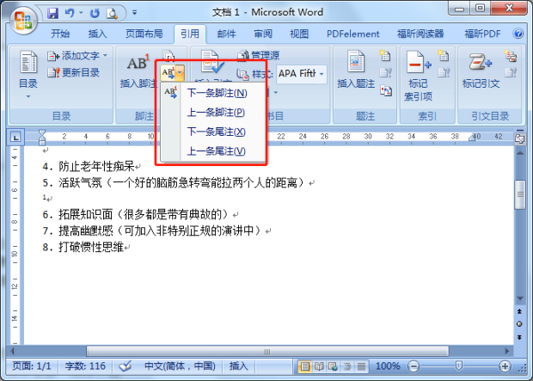 6、点击脚注切换按钮,就可以切换到下一条或者上一条脚注的位置
