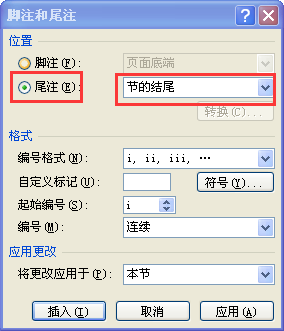 1、插入-》引用-》尾注和脚注=》出现对话框,选尾注,点插入按钮。