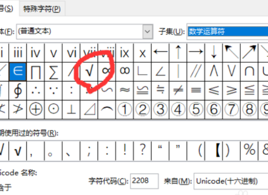 5、在接着打开的对话框中选择“普通文本”字体,子集选择“数学运算符”,即可找到对号,点击对号即可插入到文档中。