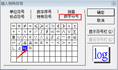 依次点击“插入”-“特殊符号”,点击“数学符号”,选择对数符号即可。