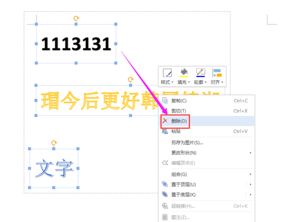 如果要一个个艺术字删除,可以用左键单击选中艺术字,可以一个个点退格键删除掉