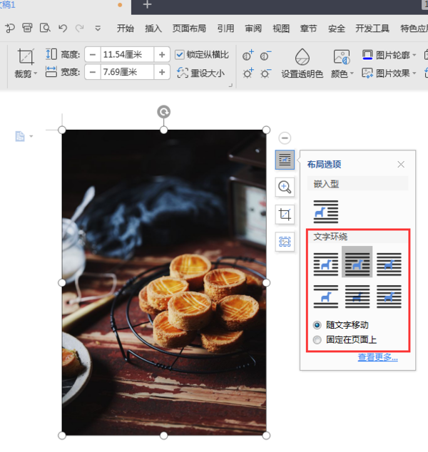 2、如果与文字混排,只要把图片设置为“四周型环绕“、紧密型环绕”,就可以在页面中任意移动。