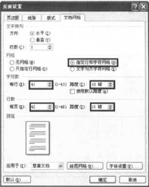 步骤3:在“网格”列表区选择“指定行和字符网格”,然后在“字符数”编辑框中指定每行显示的字符数,此处为41;在后面的“跨度”编辑框中指定字符之间的距离,此处为10磅。