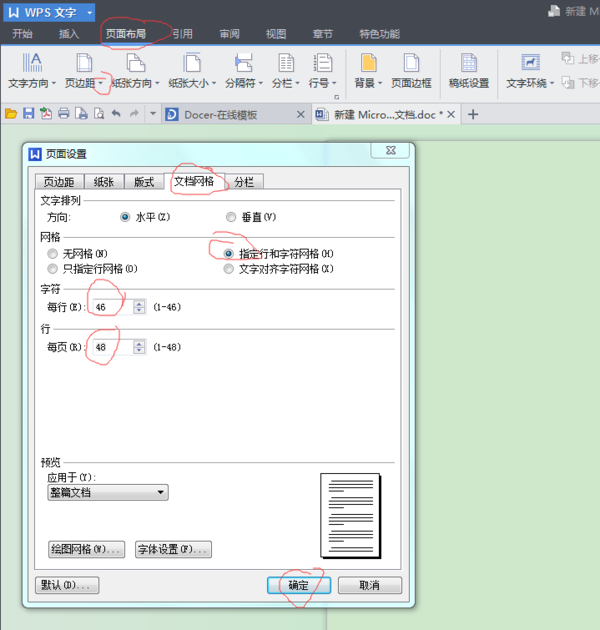 注:如果设置中出现的字符数或行数不够,可以调节纸张大小(页边距)。