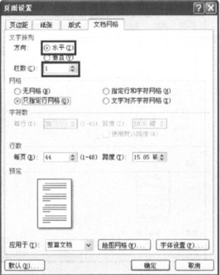 步骤2:切换至“文档网格”选项卡,在“方向”列表区选择“水平”,表示文档中的文字自左向右横向排列,在“栏数”编辑框中设置“栏数”为“丨”,表示无分栏,如图1所示。