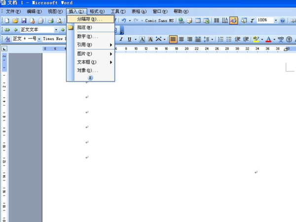 4、点击菜单栏的“插入”,在下拉选项选择“分隔符”,如图所示
