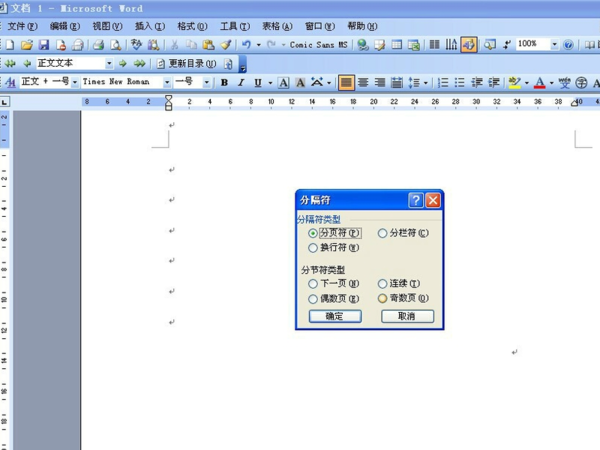 5、在“分隔符”对话框,选择“分页符”,最后,点击“确定”如图所示